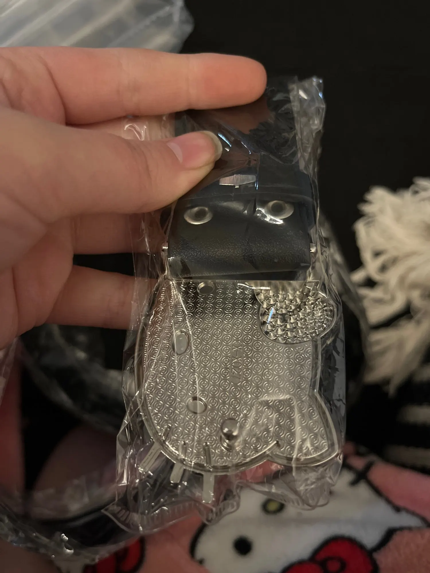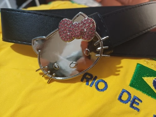 Add a touch of sparkle to your outfit with this Kawaii Sanrio Hello Kitty head rhinestone belt. Available in white, pink, and black, this adorable accessory combines cuteness and glamour, making it a versatile addition to any wardrobe. Perfect for fans who want to shine in style!